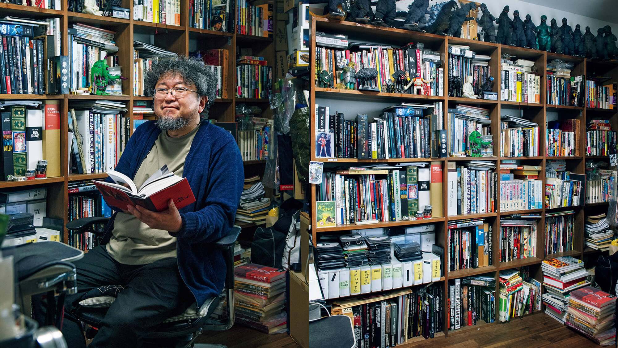 玄関に足を踏み入れた瞬間からただならぬ気配は感じていた。リビングルームの壁にはマニアックな洋画・邦画のポスターやフィギュアが並び、飾り棚には宇宙戦艦のプラモデルや怪獣・怪人をぎゅうぎゅうにディスプレイ。そしてトドメはこの書斎。本棚上部に鎮座...